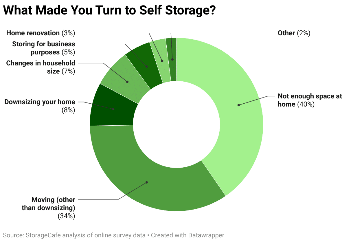 In fact, the need for more space is common among all self-storage users: 40% of survey respondents listed this as their primary reason for renting storage space (up from 33% in last year’s survey). The next highest share of self-storage users said moving was their main reason.