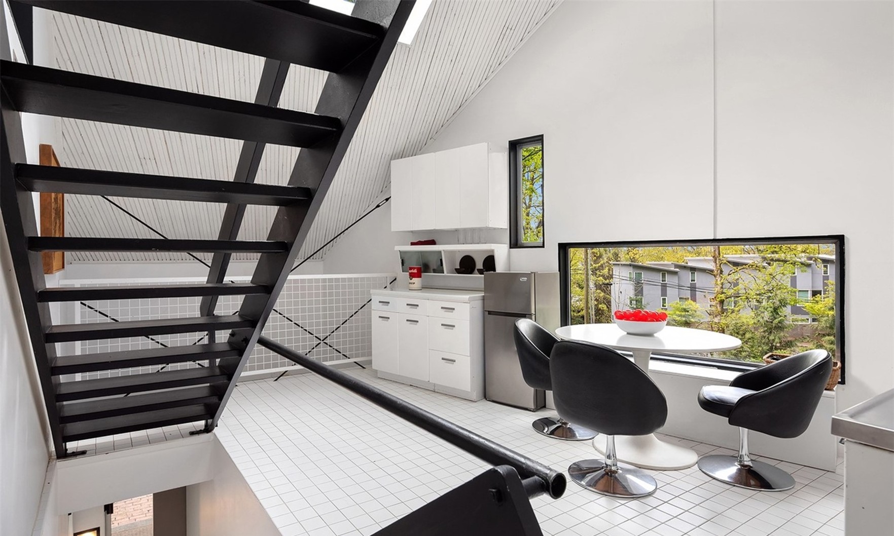 The two-bedroom, two-bathroom property includes unique features like a floating staircase, a triangular terrace and a number of sculptural elements.