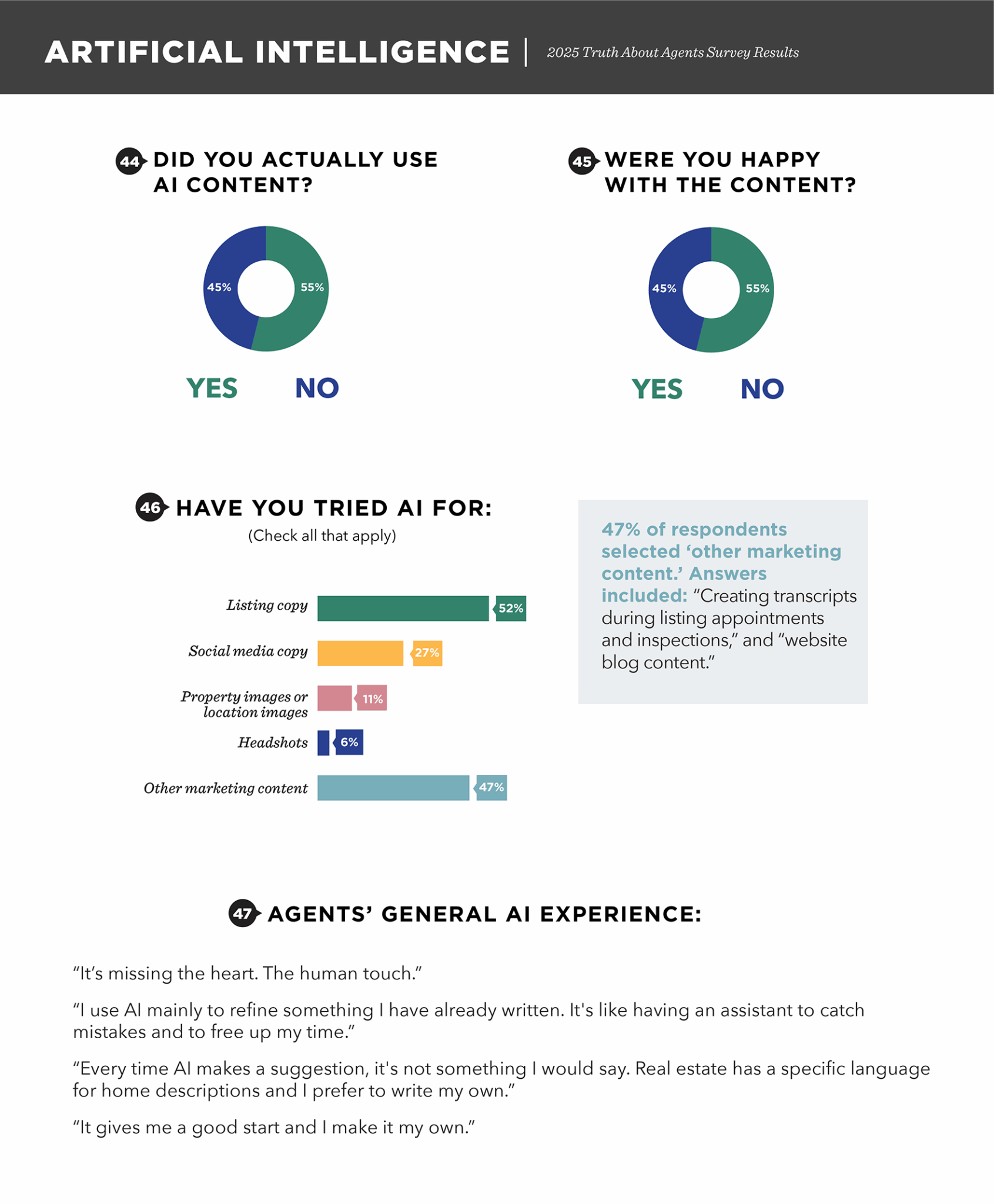 This year, we dove deep into earnings to determine the percentage of agents earning $200,000 or more per year and $100,000 or more per year. Another hot topic this year is AI, namely how agents are using it and whether they view it as effective. AI is shaping every business sector and real estate is no exception. Based on the survey results, it’s clear some agents are embracing this new technology.