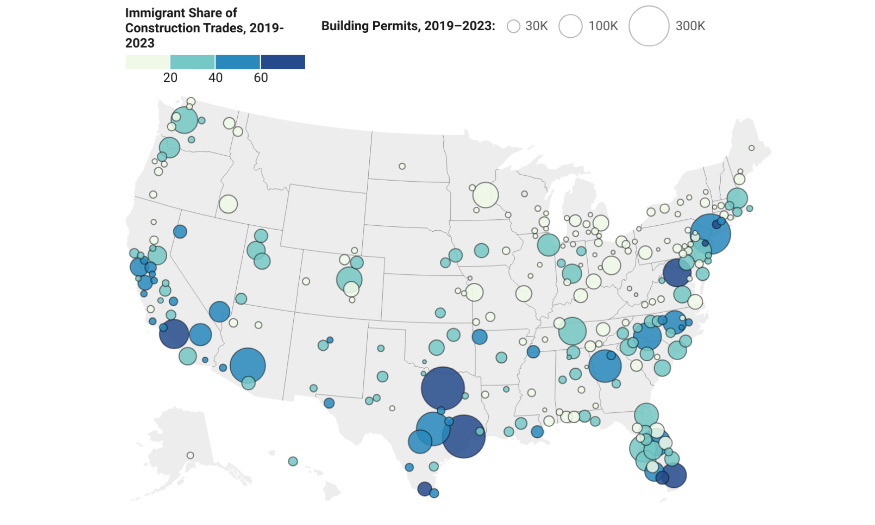 In Dallas–Fort Worth–Arlington, which led the nation in homebuilding permits at 350,000, 61% of the workers in the trades had immigrated to the country.